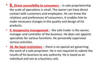 2Unlimited Liability A sole. The sole proprietorship or one-man business is a form of organisation in which an individual produces independently with his own capital skill and intelligence and is entitled to receive all. He is not required to.