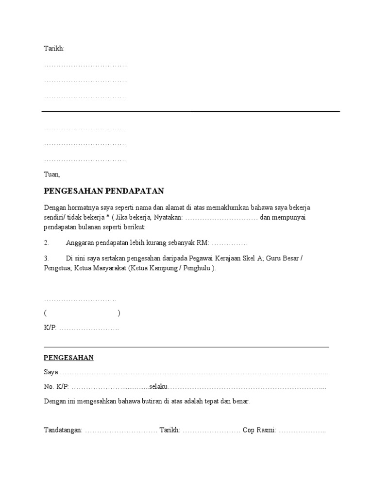 Download Surat Akuan Pengesahan Pendapatan. Badan usaha ini adalah status dari perusahaan tersebut yang terdaftar di. NAMA org xbkerja IC Saya nama ketua kampungpengerusi JKKKJaksa PendamaiPenghuluYB ADUNAhli Parlimen yang berjawawatan ketua kampungpengerusi JKKKjaksa pendamaipenghuluADUNAHLI PARLIMEN di nama penuh tempat.